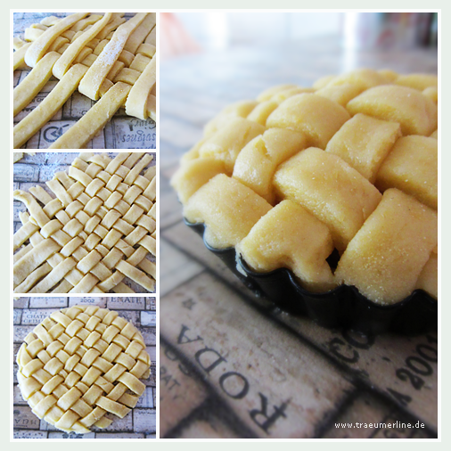 Dann rollt die 2. Hälfte des Teigs sehr dünn aus. Hiermit formt ihr die Deckel für die kleinen Kuchen. Ihr könnt ihn flechten, einfach nur drauflegen und einschneiden oder auch mit Ausstechförmchen Formen ausstechen und somit einen Deckel „bauen“. Das Flechten sieht glaube ich am eindrucksvollsten aus und psssst – das geht auch ganz leicht (was ich selber nicht gedacht hätte :girl: ). Legt einfach senkrecht zu euch mehrere dünne Stränge Teig nebeneinander, klappt dann jeden 2. Strang von oben her etwas nach unten. Legt einen Teigstrang quer und klappt die senkrechten Stränge zurück. Nun gehts immer von unten her weiter. Versetzt wieder jeden 2. Strang hochklappen, Teigstrang quer drauflegen, senkrechte Stränge zurückklappen und versetzt wieder jeden 2. Strang hochklappen usw. usw. usw. – ganz einfach. Am Ende habe ich den geflochtenen Teig mit einem Pfannenwender hochgenommen auf den Kuchen gelegt und am Rand der Form abgedrückt.