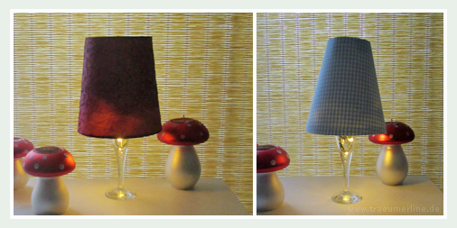 Wie ihr seht: ein Schnappsglas (z.B. Ikea), eine batteriebetriebene Mini-Lichterkette und ein Lampenschirm mit tiefsitzender Fassung bzw. der selbstgebastelte nach dem Download reichen