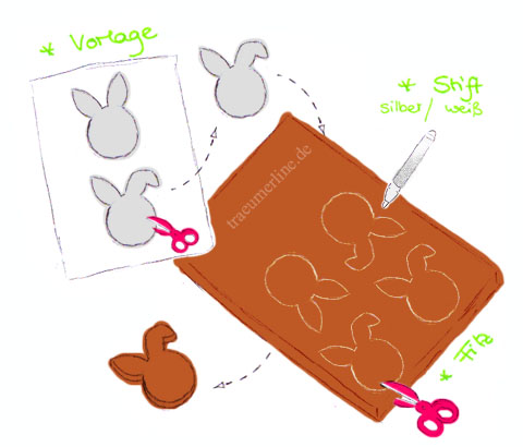 ✤ Druckt euch die Vorlage aus, schneidet die beiden Hasen aus (ignoriert hierbei die Schleife der Hasendame) und übertragt die Vorlage 4x auf das Filz (heller Stift und auf die Rückseite des Filz)
