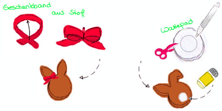 ✤ für die Schleife der Hasendame: Ein Stückchen Geschenkband aus Stoff wie auf dem Bild übereinanderlegen