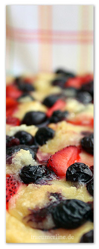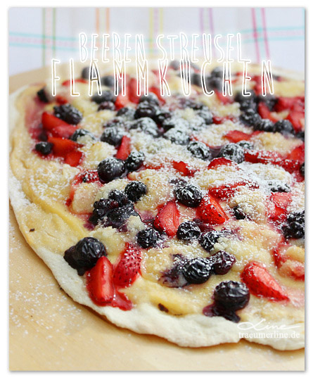 Als ich euch neulich die Erdbeer-Vanille-Ecken vorgestellt hab, hab ich gleich noch eine zweite beerige Leckerei produziert. Ich hatte nämlich schon lange im Hinterkopf die Idee von süßem Flammkuchen. Das musste ich endlich ausprobieren. Und ich kann es nur so sagen:
