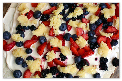 6. Gebt die Schmandmasse (den Belag) drauf und verteilt die Beeren und zum Schluss die Streusel auf dem Teig.