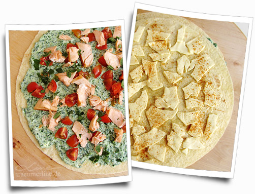 • „zupft“ den Lachs in Stücke und verteilt ihn ebenfalls auf dem Wrap