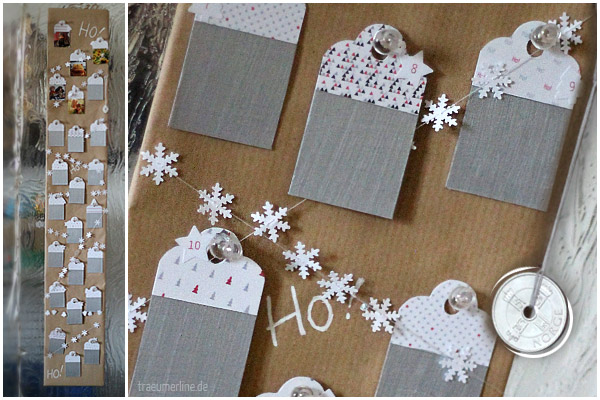 Ich hab Mum übrigens auch einen Kalender dieser Art gemacht. Das Endergebnis entstand aus einem Stück Pinnwand, überzogen mit Packpapier und umwickelt mit einer Schnur aus ausgestanzten Schneeflöckchen, Sternchen und Tannenbäumchen. Und so sieht er aus:
